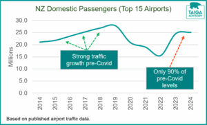 Domestic passenger numbers for New Zealand’s top 15 airports were only 90% of pre-Covid levels in FY2024. That’s a tough environment for any business sector – and not surprising given Air New Zealand’s well documented engine issues, a chronic shortage of domestic airline competition, and wider economic challenges.