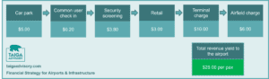 Let’s look from a practical perspective. The passenger’s airport journey is basically a value chain, driving the airport’s revenue base. Take this simple illustrative example showing a hypothetical airport’s revenue yield derived from a departing passenger: